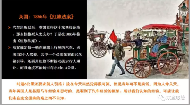 實(shí)際上,這就是“經(jīng)驗(yàn)”在作祟。我們現(xiàn)代人之所以覺得《紅旗法案》很可笑,是建立在我們對如今汽車的認(rèn)知經(jīng)驗(yàn)上。而當(dāng)時(shí)的英國人則是建立在對當(dāng)時(shí)盛行的馬車的認(rèn)知經(jīng)驗(yàn)上。