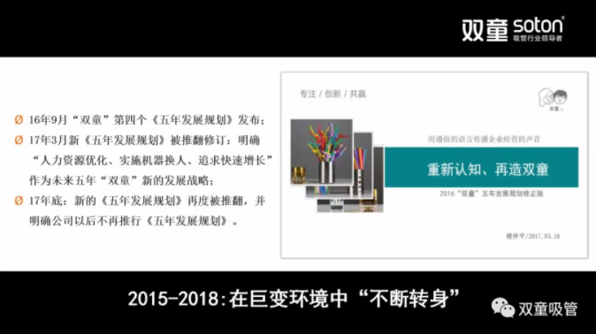 但在2015年以后,在持續(xù)增長受限的現(xiàn)實(shí)情況下,我們逐漸意識到原先堅(jiān)持的“做減法”模式已經(jīng)慢慢成為了企業(yè)發(fā)展的瓶頸。- 2016年9月“雙童”第三個(gè)《五年發(fā)展規(guī)劃》發(fā)布。但在發(fā)布以后,我們也發(fā)現(xiàn)在巨變時(shí)代下,短短幾個(gè)月時(shí)間內(nèi)外部環(huán)境就會產(chǎn)生巨大變化,企業(yè)經(jīng)營往往“計(jì)劃趕不上變化”;