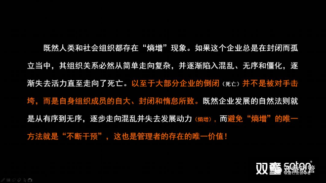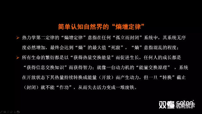 “熵”,是來自于物理學(xué)熱力學(xué)第二定律的一個詞。“熵增定律”意指在任何“孤立而封閉”系統(tǒng)中,其系統(tǒng)無序度必然增加,最終會達到“熵”的最大值“死寂”。簡單理解就是:任何一個人,任何一個組織,乃至于任何一個家庭,如果你把自己封閉起來,你的內(nèi)部一定是從有序到無序。如果你繼續(xù)封閉,它的混亂程度一定會達到最大值,一直到死寂。“雙童”樓仲平也曾多次在課程分享中引用熱力學(xué)第二定律的“熵增定律”,把“雙童”存在的問題通過自然的現(xiàn)象加以挖掘、頗析、呈現(xiàn)、對照,從而來尋求問題解決的方法。樓仲平分享的“熵增定律”PPT頁面