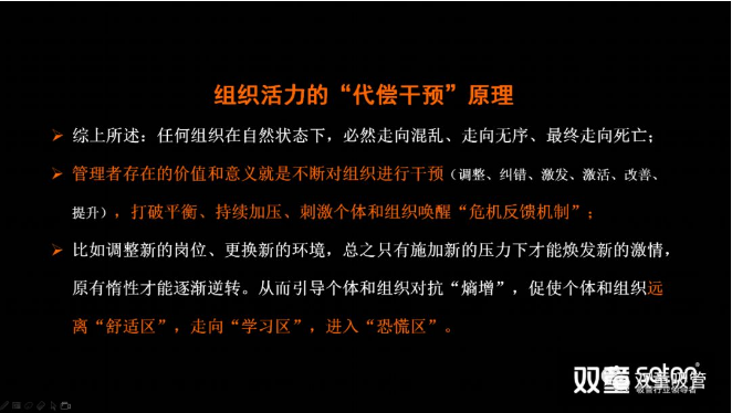 對于企業(yè)而言其實也是如此,如果一個企業(yè)總是在封閉而孤立當(dāng)中,其組織關(guān)系也必然從簡單走向復(fù)雜,并逐漸陷入混亂、無序和僵化,逐漸失去活力直至走向了“死亡”。而避免“熵增”的唯一方法就是管理者持續(xù)開放和組織干預(yù),從而打破平衡,持續(xù)加壓、刺激個體和組織喚醒“危機反饋機制”,從而讓個體和組織遠(yuǎn)離“舒適區(qū)”,走向“學(xué)習(xí)區(qū)”,進入“恐慌區(qū)”,原有惰性才能逐漸逆轉(zhuǎn),從而煥發(fā)出新的活力!樓仲平分享的“熵增定律”PPT頁面