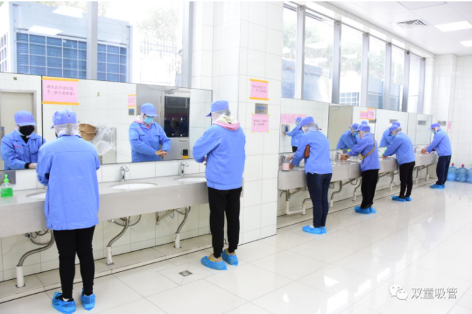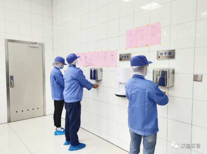 員工們洗手、烘干、消毒后正式進入車間比賽
