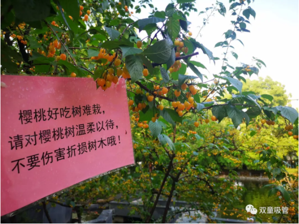 咦?櫻桃樹上除了有櫻桃,還有一塊牌子呢!原來,為了讓櫻桃樹更好的生長,“雙童人”在每棵櫻桃樹上都掛了標(biāo)語牌,提醒大家在摘櫻桃時不要折損傷害櫻桃樹。