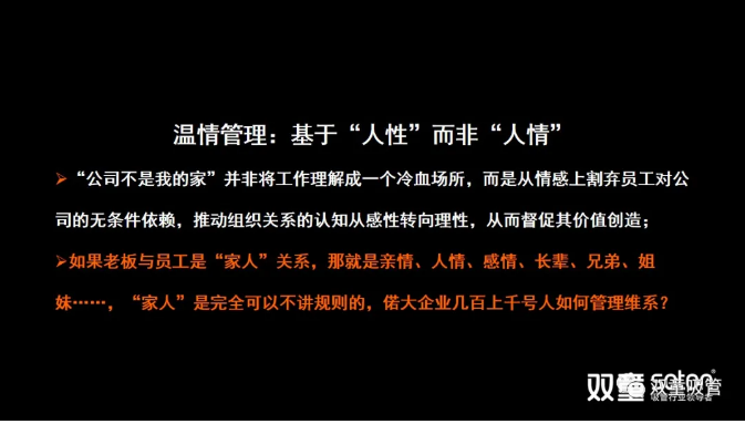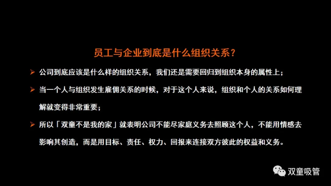 需要強(qiáng)調(diào)的是,我們推行“雙童不是你的家”,并非是將“雙童”營(yíng)造成一個(gè)冷血場(chǎng)所,而是讓員工從情感上割棄對(duì)公司的無(wú)條件依賴,將對(duì)組織的認(rèn)知從感性轉(zhuǎn)向理性,運(yùn)用職業(yè)化思維引導(dǎo)員工價(jià)值創(chuàng)造。