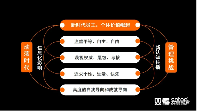 同時(shí),大量在互聯(lián)網(wǎng)信息時(shí)代下成長(zhǎng)起來(lái)的90后、00后員工進(jìn)入工作崗位。他們的思維與以往的老一代有所不同:他們有著高度的自我導(dǎo)向和成就導(dǎo)向,更加注重平等、自主和自由,蔑視權(quán)威、層級(jí)和考核。這表示我們進(jìn)入了一個(gè)體價(jià)值的崛起的時(shí)代。