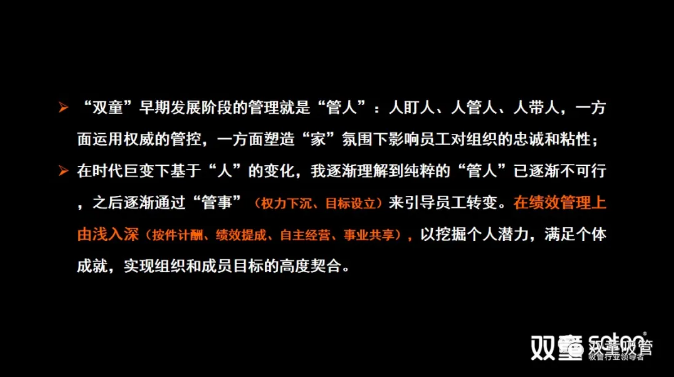 “雙童”在以往的管理形式上采取“管人”的模式,各項(xiàng)事務(wù)都通過(guò)層級(jí)指令、管控執(zhí)行。在時(shí)代巨變下,基于“人”的變化,我們理解到純粹的“管人”已逐漸不可行。