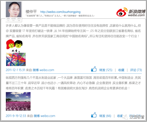 社會(huì)的進(jìn)步一直在更替信息交流的傳播方式,從面對(duì)面的口碑傳播到今天的互聯(lián)網(wǎng)信息傳播,從被動(dòng)傳播到主動(dòng)傳播,從他人傳播到自我傳播,傳播的技術(shù)手段一直在不斷更新中,而微博作為目前傳播速度最快、傳播范圍最廣、傳播成本最低的自媒體工具正被大眾所認(rèn)知。作為企業(yè)主,尤其是一個(gè)成熟企業(yè)的企業(yè)主,無論再忙都不應(yīng)該忽視企業(yè)的品牌建設(shè),我平時(shí)在企業(yè)一般不管生產(chǎn),不管銷售,也不管人事,因?yàn)檫@些都已經(jīng)由更專業(yè)的下屬去管了,唯一我一直主管并參與的工作,就是品牌的傳播和企業(yè)的產(chǎn)品技術(shù)創(chuàng)新。而微博是企業(yè)的平民面包,誰都能做,誰都有機(jī)會(huì)到這個(gè)平臺(tái)上發(fā)布信息,誰都有可能在微博上形成自己的圈子和互動(dòng)平臺(tái),從而實(shí)現(xiàn)自己品牌在微博平臺(tái)上的不斷傳播。