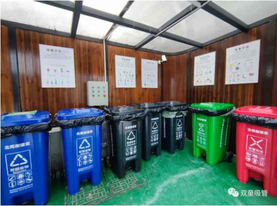 在“雙童”的二期廠房有一間精致漂亮的小木屋。這就是“雙童”的垃圾分類投放房,在這間小木屋內(nèi)實現(xiàn)了“雙童”兩個廠區(qū)所有生活垃圾的分類和投放工作。每一位員工都會定期將自己的生活垃圾送往這里進行分類投放 。 在“雙童”的垃圾投放房里各有紅綠藍黑等多個顏色的垃圾分類桶,分別將廠區(qū)的生活垃圾分為了易腐垃圾、其他垃圾、可回收物、有害垃圾四大類。如果你仔細觀察,就會發(fā)現(xiàn)“雙童”的投放指南上,還對可回收物中的紙張資源和瓶罐資源進行了細分。