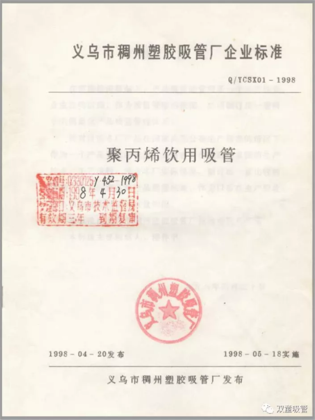 終于在1997年10月,由“雙童”前身的義烏市稠州塑膠吸管廠起草的《聚丙烯飲用吸管》企業(yè)標(biāo)準(zhǔn)順利通過審核,于1998年4月正式發(fā)布,成為當(dāng)時(shí)中國(guó)吸管行業(yè)最早的產(chǎn)品標(biāo)準(zhǔn)。從此,“雙童”打開了產(chǎn)品在商超場(chǎng)所的銷售渠道,實(shí)現(xiàn)了傳統(tǒng)家庭作坊企業(yè)向正規(guī)工廠的轉(zhuǎn)型。