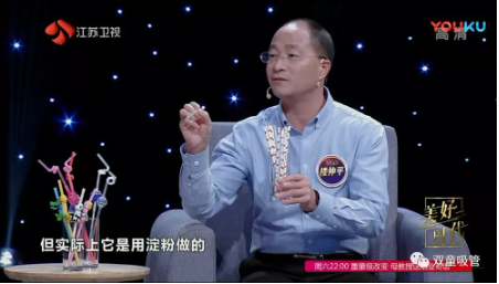 在“雙童”樓仲平上場(chǎng)后,主持人趙丹軍就被桌子上的各類吸管所吸引啦!樓仲平也向在場(chǎng)觀眾介紹了美觀環(huán)保的可降解吸管和極具特色的創(chuàng)新吸管。