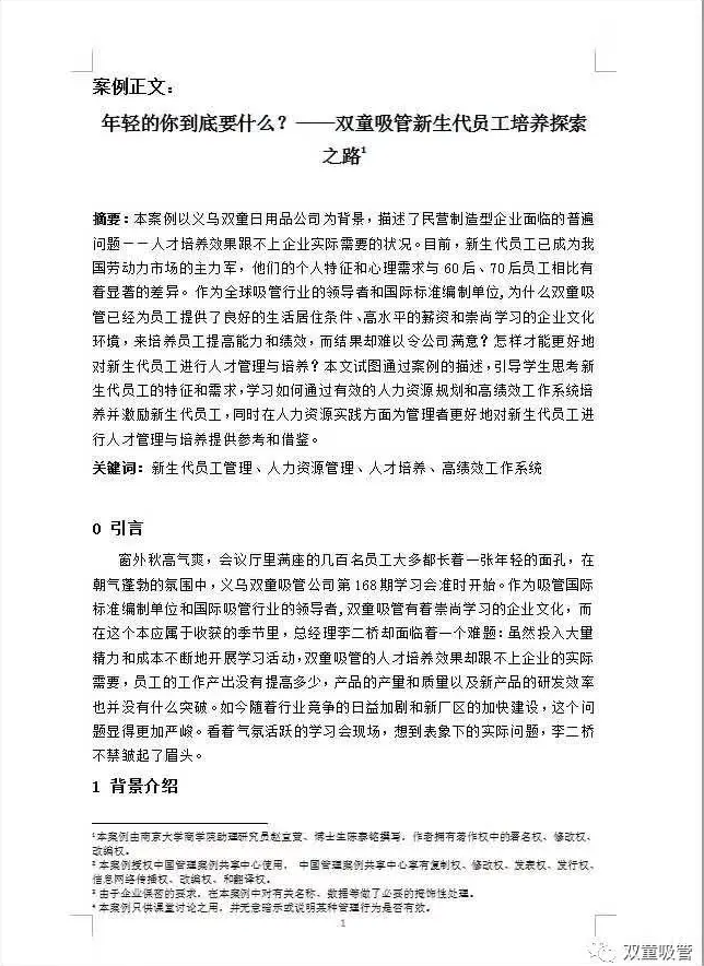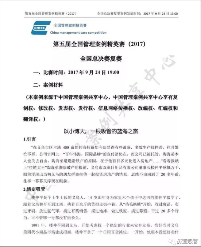 截止到目前,以“雙童”為主題的案例進入到國家案例庫的數(shù)量就高達(dá)5件。其中南京商學(xué)院研究案例《年輕的你到底要什么?——雙童吸管新生代員工培養(yǎng)探索之路》、浙江工業(yè)大學(xué)研究案例《以小博大,一根吸管的藍(lán)海之旅》兩件研究案例更是被評為了2016年度百優(yōu)案例!浙江工業(yè)大學(xué)研究案例《以小博大,一根吸管的藍(lán)海之旅》還成為了2017年精英賽總決賽的案例!