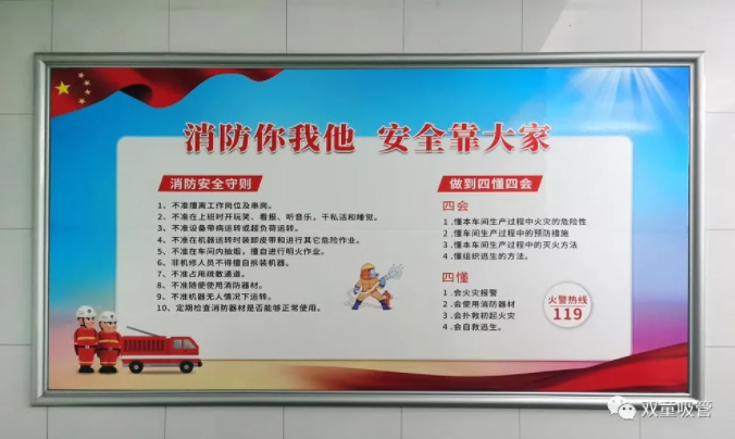 在“雙童”,各類宣傳標識、消防器材隨處可見,安全意識深入人心!正是因為“雙童”對安全生產(chǎn)的這份敬畏之心,才讓每一位員工心中都筑起了一道安全防線。