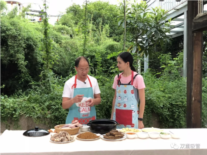 樓仲平正在和主持人介紹所需食材