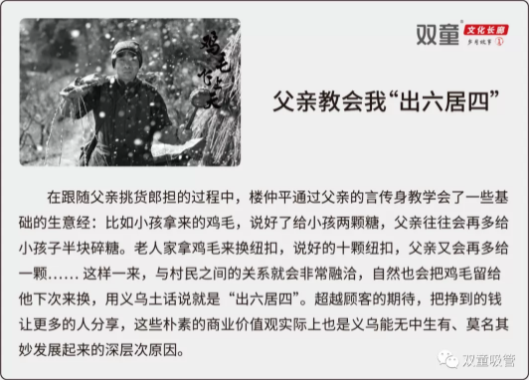 跟隨著爸爸挑貨郎擔(dān)的過程當(dāng)中,我也學(xué)到了很多東西。 比如說,在換雞毛時,原本給小孩兩顆糖,爸爸會再多給小孩半塊碎掉的糖;有些人過來換紐扣,原本說好十顆紐扣,爸爸會再多給一顆…… 這樣一來,村民們就會記得我們的好,就算下次別的貨郎經(jīng)過這里,他們也不會把雞毛給別人,而是留著給我們。 后來我才理解這是義烏商人特有的品質(zhì),用義烏土話說就是“出六居四”,做生意多給別人一些,要先想別人(利他經(jīng)營),超越顧客的期待,讓顧客占點(diǎn)便宜,別人才會更愿意和你做生意,生意才會越做越好。 雖然現(xiàn)在義烏人早已不從事“雞毛換糖”,但無論做生意還是辦企業(yè),都延續(xù)了這一價值觀,這實(shí)際上也是義烏能發(fā)展得越來越好的深層原因。