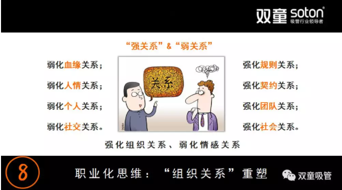 在現(xiàn)代社會中,不少人把企業(yè)經(jīng)營管理與人情社交關(guān)系掛鉤。于是,他們過于注重個人的社交和人情關(guān)系,整天忙于各種社交,從而希望取得所謂的社交關(guān)系!但企業(yè)發(fā)展到一定規(guī)模時,僅靠個人的社交關(guān)系是無法建立企業(yè)健康的社會關(guān)系。弱化血緣關(guān)系,強(qiáng)化規(guī)則關(guān)系