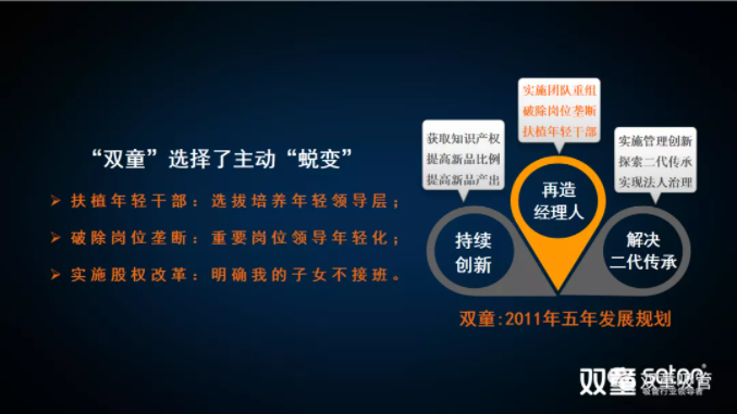 2010年底開始,“雙童”中高層管理團(tuán)隊便被要求一起學(xué)習(xí)德魯克思想,通過共同學(xué)習(xí)的方式,促進(jìn)德魯克思想在經(jīng)營層面的管理實(shí)踐。在之后短短三年時間里,“雙童”確立“再造經(jīng)理人”制度,催生出新生代經(jīng)理人團(tuán)隊,到確立法人治理、建立企業(yè)傳承的機(jī)制,推動“雙童”從家庭作坊到現(xiàn)代化企業(yè)徹底轉(zhuǎn)型。