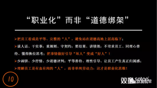 在“理性”思維的持續(xù)引導(dǎo)下,“雙童”在文化中倡導(dǎo)把員工看成是平等、完整的“人”,而非站在道德高地上居高臨下,處處體現(xiàn)尊重、公平和雙贏(yíng)。我們理解員工是有血有肉的“人”,而非單純的勞動(dòng)力,對(duì)待員工少“畫(huà)餅”,少抒情,懂得換位思考,不去“道德綁架”員工,才能讓員工真正產(chǎn)生歸屬感。