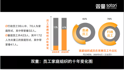 “雙童”在“家文化”推行過程當中,讓員工能夠安心地在公司工作、生活、戀愛,形成了濃厚的“家文化”氛圍!直到現(xiàn)在,已經(jīng)有140個家庭在“雙童”落戶,其中最多的一家有11個人住在公司。其中,有的把父母和孩子接過來一起照料,也有單身漢在“雙童”找到人生伴侶,擁有了幸福的家庭。