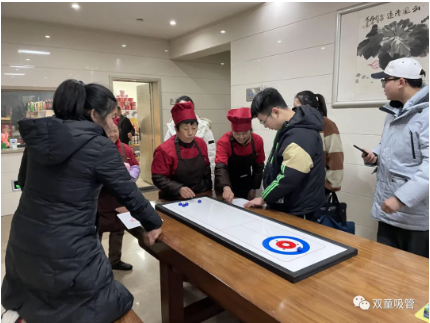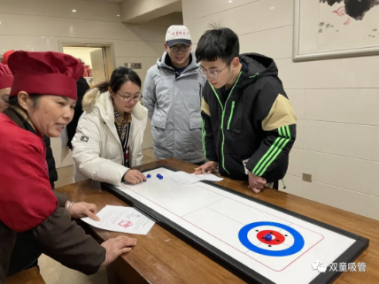 桌上冰壺看起來(lái)不大,難度系數(shù)卻爆表了!吸管妞試過(guò)幾次都沒(méi)能成功,一下子對(duì)冰壺這個(gè)游戲肅然起敬了!然而,讓吸管妞感到意外的是,“雙童”的“選手們”卻紛紛在游戲現(xiàn)場(chǎng)大顯神通,讓妞大開(kāi)眼界!