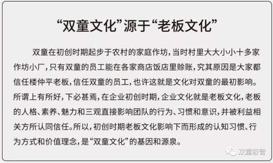 深究這其中的原因,都是大家對樓仲平的信任,從而對“雙童”的員工也產(chǎn)生了信任,最初的企業(yè)文化更多來源于老板文化。在企業(yè)初創(chuàng)時期,老板的人格、素養(yǎng)和魅力(三觀)直接影響團隊的行為、習慣和意識,并被利益相關方所認同信任。所以,初創(chuàng)時期老板文化影響下而形成的認知習慣、行為方式和價值理念,是“雙童文化”的基因和源泉。