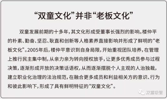 在改革過程中,樓仲平重視團隊培養(yǎng),在管理上推行民主集中制,從親力親為轉向授權放手,讓更多優(yōu)秀成員參與過程決策,逐漸形成開放的決策話語圈。從而逐漸擺脫個人主觀的人治獨裁,建立職業(yè)化治理的法治規(guī)范,在融合更多成員和利益相關方的意識、行為和彼此影響下,形成了具有鮮明特征的“雙童文化”。