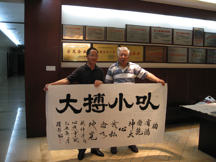 2009年5月12日,國家一級美術(shù)師醒醉、原名沈芳(教援),應(yīng)公司董事長樓仲平先生的邀請來我司現(xiàn)場揮毫,迎來眾多書畫愛好者觀看。大師結(jié)合公司董事長多年以來堅(jiān)持的經(jīng)營理念和公司產(chǎn)品及企業(yè)文化特點(diǎn),揮筆寫下《以小博大》、《胸懷》和《遠(yuǎn)瞻》等名作,并同樓仲平先生現(xiàn)場合影.