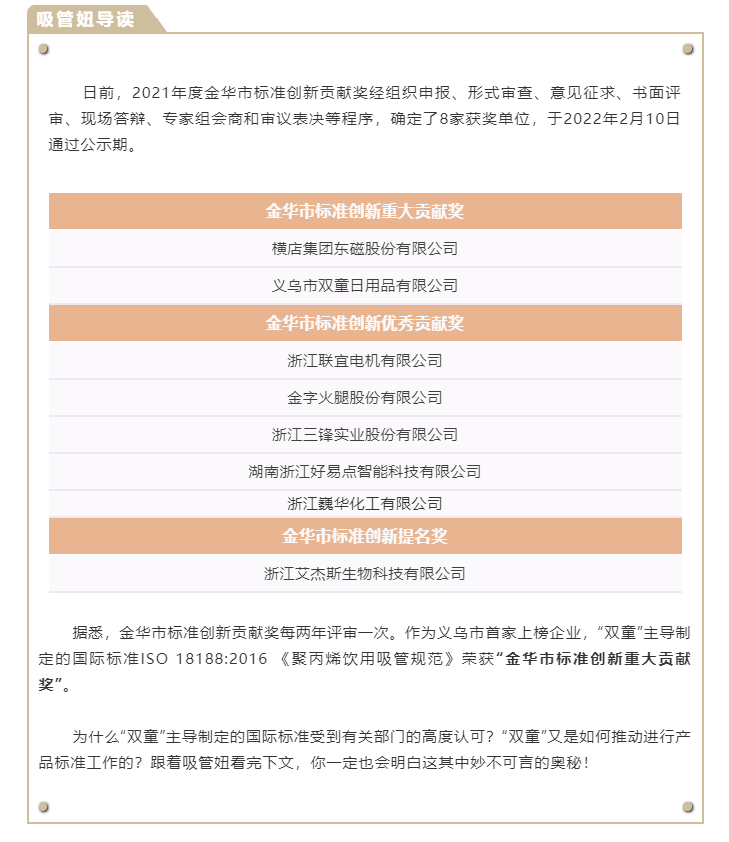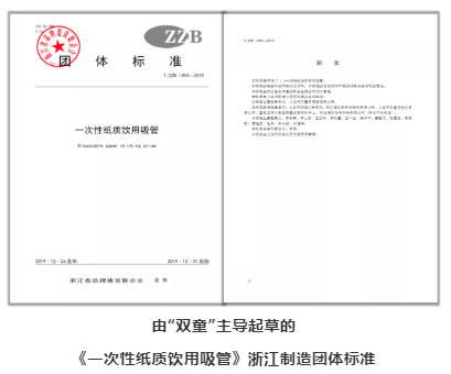 在此過程中,樓仲平帶領“雙童”緊隨市場發(fā)展的步伐,相繼在2014-2016年期間主導起草制定了《聚乳酸冷飲吸管》中國行業(yè)標準和浙江團體標準,在2019年又主導起草編制了《一次性紙質飲用吸管》浙江團體標準。