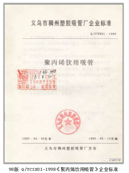 終于在1997年10月,由“雙童”前身的義烏市稠州塑膠吸管廠起草的《聚丙烯飲用吸管》企業(yè)標準順利通過審核,于1998年4月正式發(fā)布,成為吸管行業(yè)最早的產品標準。從此,“雙童”打開了產品在商超場所的銷售渠道,實現了傳統家庭作坊企業(yè)向正規(guī)工廠的轉型。