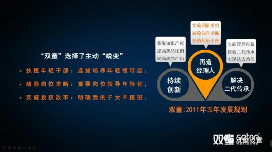2010年,樓仲平在理解人性活力的“自然遞減”的現(xiàn)象以及經(jīng)理人老化自然規(guī)律后,下定決心通過《雙童五年發(fā)展規(guī)劃》的組織變革來實施解決“經(jīng)理人老化”問題:明確扶植年輕干部,選拔培養(yǎng)優(yōu)秀的年輕領導層,解決二代傳承接班等問題。
