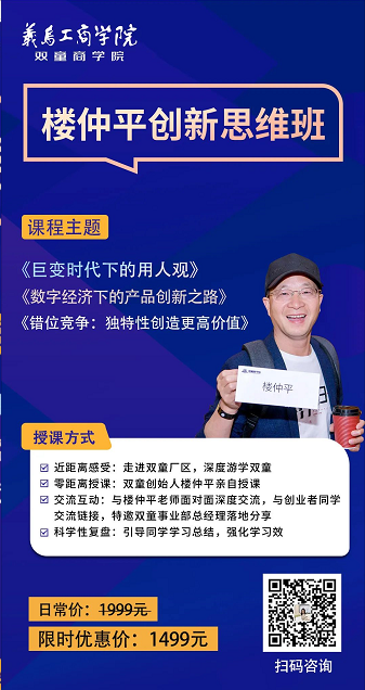 2021年,“義烏工商學(xué)院-雙童商學(xué)院”正式成立,打造義烏創(chuàng)業(yè)者“家門口的商學(xué)院”。“雙童”創(chuàng)始人樓仲平將40多年的創(chuàng)業(yè)實(shí)踐經(jīng)驗(yàn)和30多年的商業(yè)理論相結(jié)合,將曾在北大、浙大等大學(xué)分享的MBA商業(yè)實(shí)戰(zhàn)課程帶回義烏,聚焦本土中小創(chuàng)業(yè)者發(fā)展痛點(diǎn),打造 樓仲平創(chuàng)新思維班 ,并獲得了三千多名學(xué)員的一致好評!