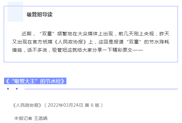 雙童:剛上央視,又見(jiàn)報(bào)了!《人民政協(xié)報(bào)》生態(tài)專題報(bào)道:節(jié)水也能省下大筆錢!