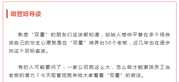 為鼓勵(lì)有夢想、想創(chuàng)業(yè)的員工能夠得到最大的價(jià)值體現(xiàn),“雙童”成立“雙童創(chuàng)業(yè)共享平臺”,對原有組織結(jié)構(gòu)進(jìn)行劃小組織、自主經(jīng)營,推動(dòng)工貿(mào)一體、孵化并培養(yǎng)內(nèi)部創(chuàng)業(yè)實(shí)體,賦能一批優(yōu)秀管理者、逐漸向創(chuàng)業(yè)者和經(jīng)營者轉(zhuǎn)變,共同建立“創(chuàng)業(yè)體”自主經(jīng)營!▲ “雙童”成立創(chuàng)業(yè)共享平臺