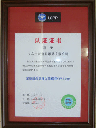 5月22日下午,義烏市總工會在北苑街道多功能廳舉行由浙江大學社會保障與公共政策研究中心(LEPP)確認的最具社會責任企業(yè)頒獎儀式,吳森民副市長出席會議并作了重要講話。我司經(jīng)評審符合企業(yè)社會會責任義烏標準YW2009全部條款的要求,并被授予“最具社會責任企業(yè)“稱號。