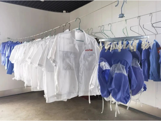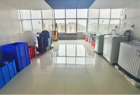 首先,是清洗場所。“雙童”的工服洗衣房就和車間清洗間配置在一起,既聯(lián)通車間,提高工服來回運(yùn)送的效率,又能夠保持相對獨(dú)立,不影響生產(chǎn)。這里的洗衣工具齊全,既有機(jī)洗區(qū)域,也有供斷電情況使用的手洗池。