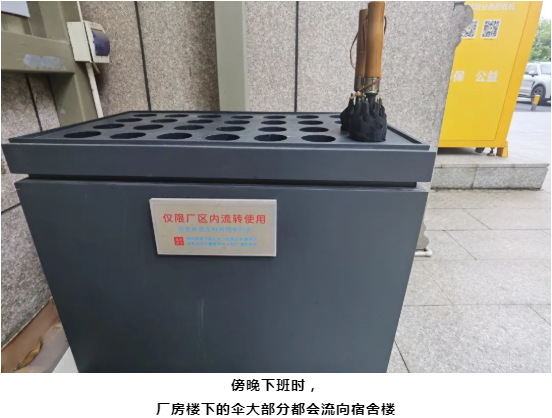 為了確保廠區(qū)內(nèi)部的儲備充足,“雙童”制定了明確的相關(guān)細則,規(guī)定個人在未經(jīng)允許的情況下禁止將流動雨傘外帶。如情況緊急,確實有需要的可在門衛(wèi)處登記去向并及時歸還,無特殊情況時,原則上流動雨傘僅限廠區(qū)內(nèi)流轉(zhuǎn)使用。