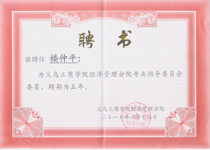 上圖:義烏工商學(xué)院授予董事長樓仲平先生指導(dǎo)委員會委員聘書