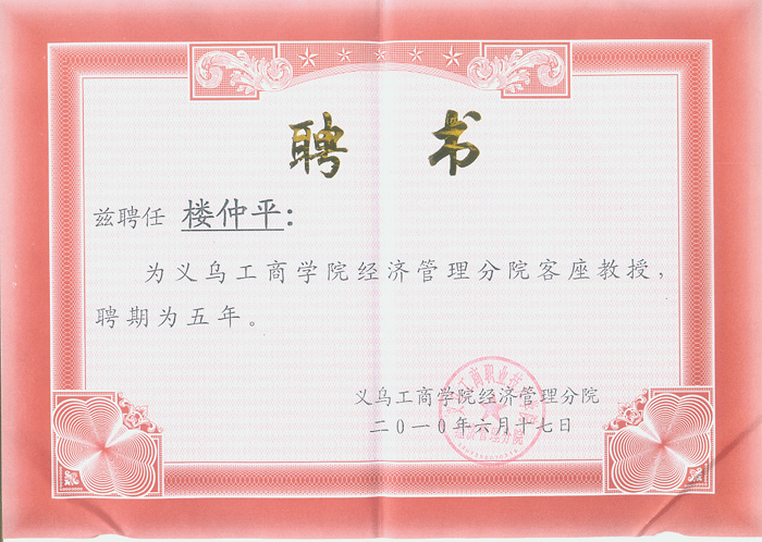 上圖:義烏工商學(xué)院授予董事長樓仲平先生客座教授聘書