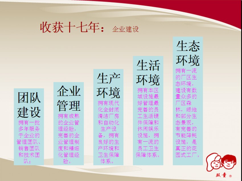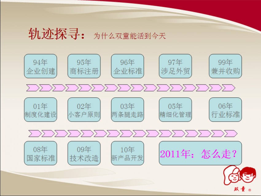 回首過去才能評判現(xiàn)在展望未。9月13日下午的培訓課上,樓總主要對《讓雙童走好下一個十年》的企業(yè)規(guī)劃進行了講解,樓總首先用PPT向所有管理人員總結了雙童在過去17年中的成績和經(jīng)驗。