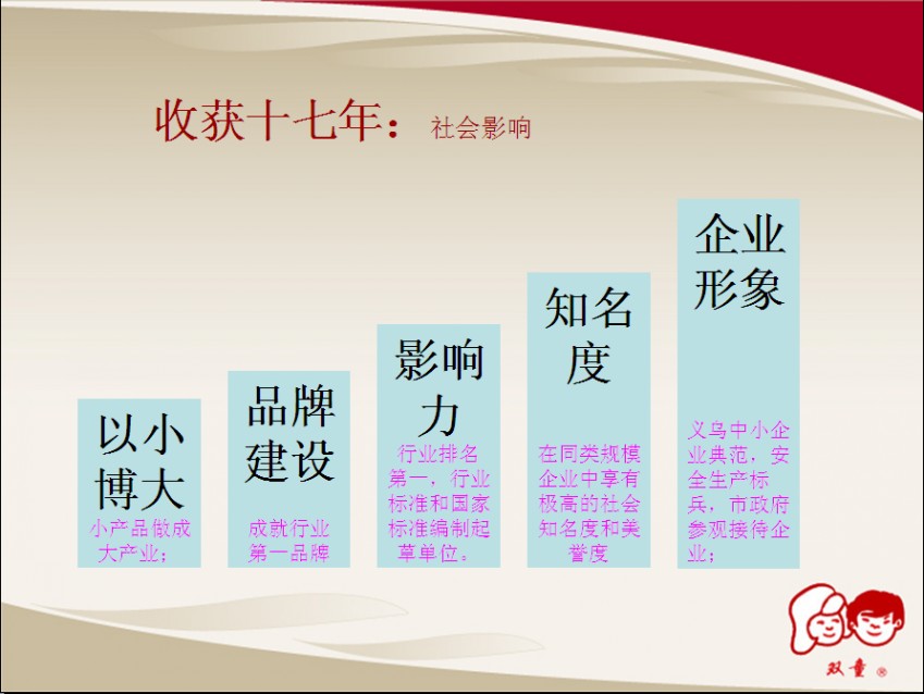 距離2006年雙童的上一個五年規(guī)劃已經(jīng)五年過去了,在這五年中,雙童完成了行業(yè)標準、國家標準的建立,成為吸管行業(yè)國家標準的起草單位;企業(yè)形象和美譽度得到很大提升,多次被中央電視臺、央視新聞聯(lián)播等節(jié)目專題報道,被譽為“義烏傳奇”;建設了義烏工商界首座集綠化和節(jié)能為一體的公司行政大樓,綠色環(huán)保功能得到傳媒界、企業(yè)界的廣泛報道和參觀;獲得了“浙江名牌產(chǎn)品”、“金華市知名商號”、“義烏市百強企業(yè)”、浙江省“清潔生產(chǎn)示范企業(yè)”、“節(jié)能降耗先進單位”、“最具社會責任企業(yè)”等等殊榮。