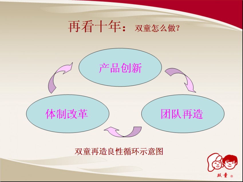 針對這一系列問題,樓仲平董事長從產(chǎn)品創(chuàng)新、團隊再造和體制改革三個方面著手,為雙童規(guī)劃了一個良性循環(huán)的發(fā)展之路。