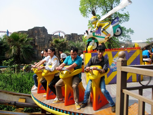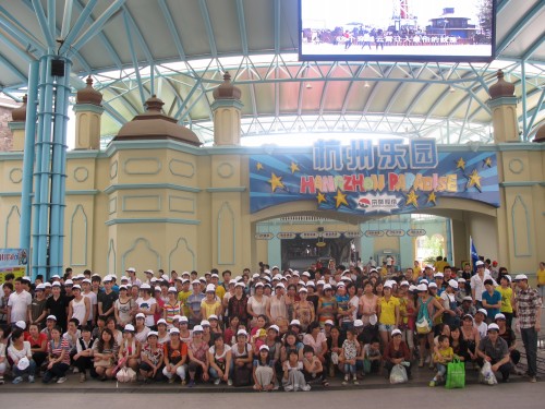 中午十一點鐘,我們出了西湖,再次回到大巴車上,直奔下一個目的地——杭州樂園。這里對于我們 整個趨于年輕化的旅游團(tuán)隊來說,無疑是最具神秘感、新鮮感、刺激感的娛樂天地。到達(dá)杭州樂園的時間 是11:30分,先來張集體大合影。此時,正值午飯時間,公司已經(jīng)為全體員工準(zhǔn)備好了午餐的餐票。后勤 處保證將餐票發(fā)送到每一位員工手中,玩的心情再急切,也要保障大家不餓著肚子。