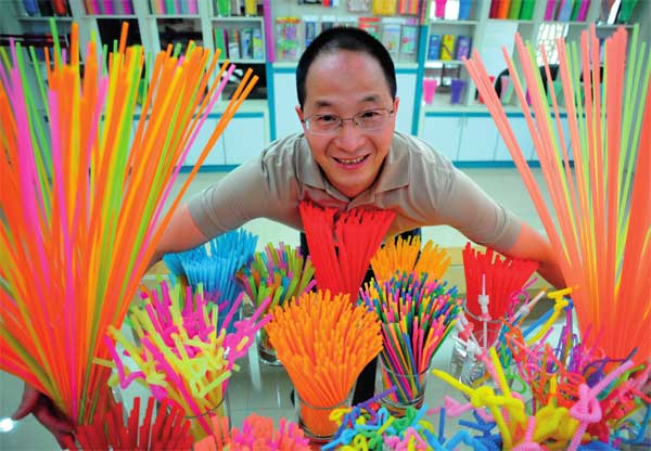 為了滿(mǎn)足小客戶(hù)的多元化需求,雙童吸管?chē)L試過(guò)各種產(chǎn)品創(chuàng)新,目前能看到的新產(chǎn)品有供兩人同時(shí)使用的情侶吸管、帶風(fēng)車(chē)功能的玩具吸管和能測(cè)溫變色的多功能吸管,甚至還有幫助兒童吃藥的吸管以及以淀粉為原料的吸管?!暗矸畚芪覀円呀?jīng)申請(qǐng)了專(zhuān)利,但一些技術(shù)性的難題尚未突破,因此量產(chǎn)還有待時(shí)日”。