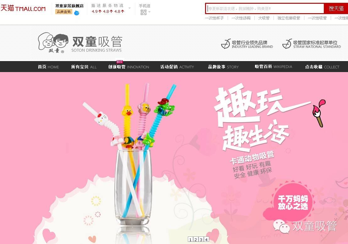 “企業(yè)要走在市場前面,才有可能成為行業(yè)領(lǐng)先者?!?/span>抱著這樣的信念,樓仲平對新鮮事物特別敏感,而這也讓他成為了第一批入駐阿里巴巴的供應(yīng)商?!?004年我就已經(jīng)結(jié)識馬云了,成為第一批網(wǎng)商。此后隨著淘寶、天貓的上線,雙童吸管也是緊跟趨勢,上線了淘寶店和旗艦店?!?/p> 如今,在雙童天貓旗艦店網(wǎng)頁上展示著愛心、動物、雙人吸管、兒童吸管等各種造型、不同功能的吸管,銷量也在節(jié)節(jié)攀升。 來源: 浙江在線-浙商網(wǎng) 編輯: 徐光
