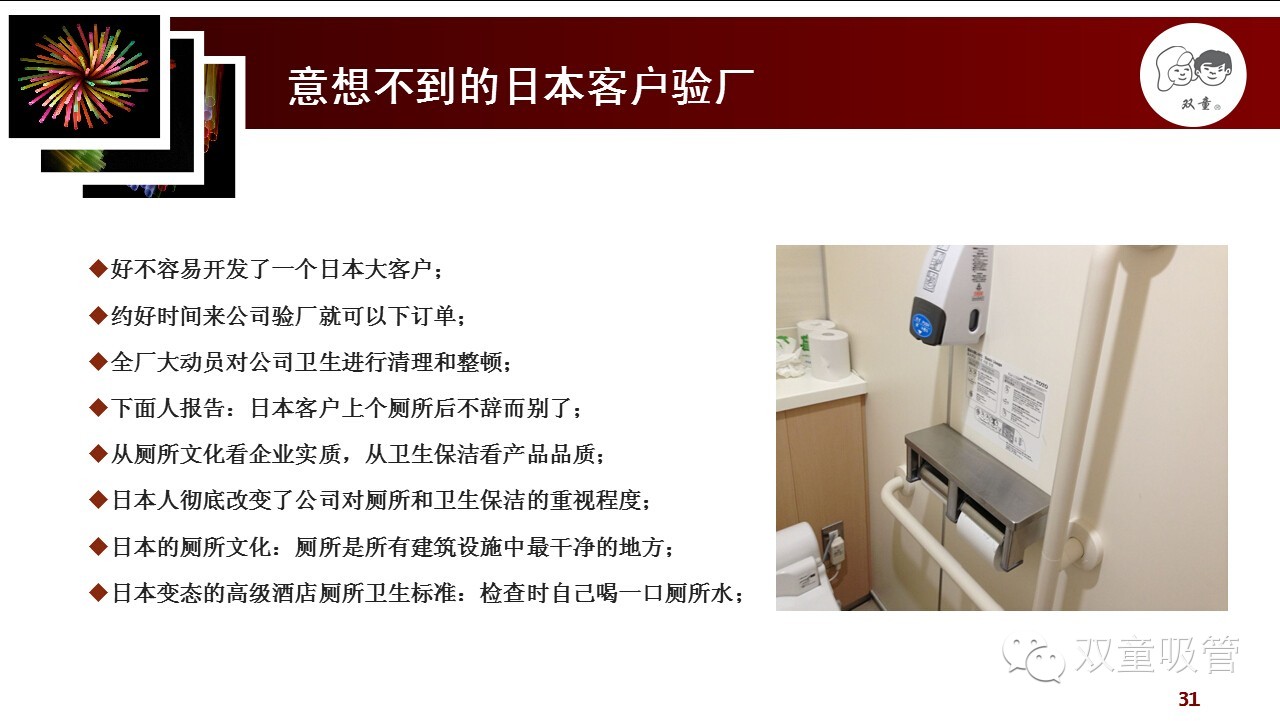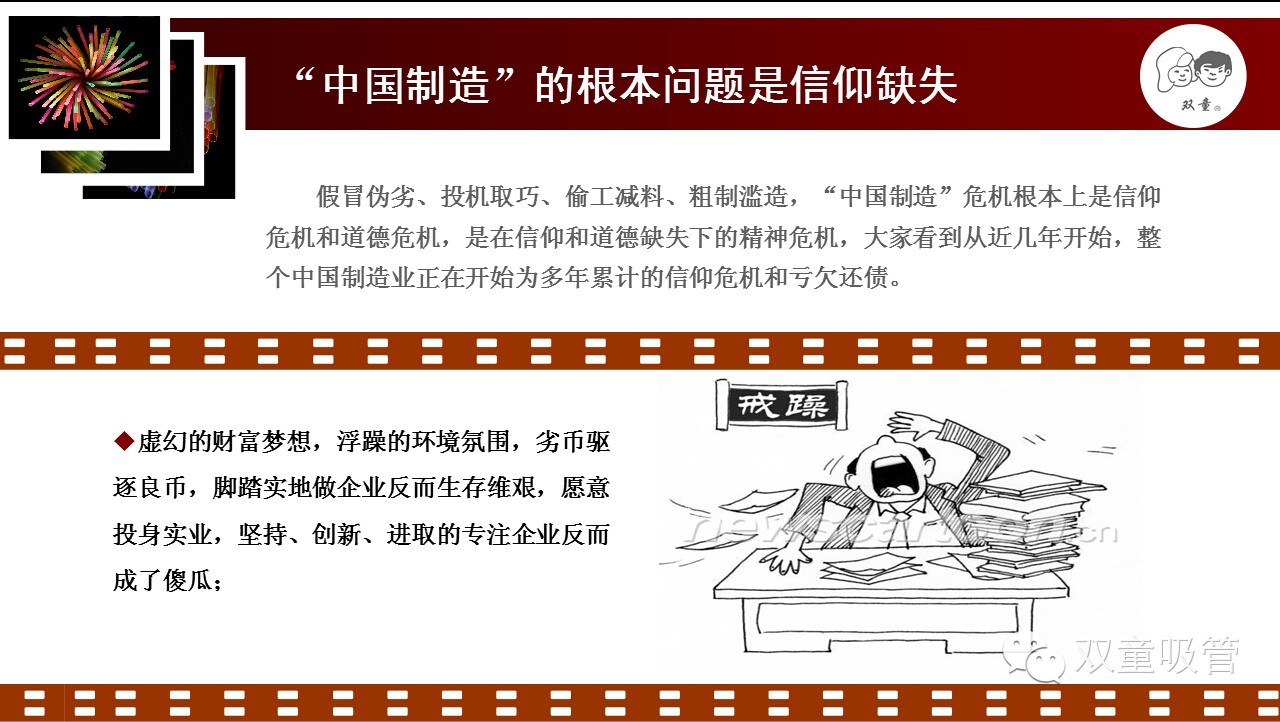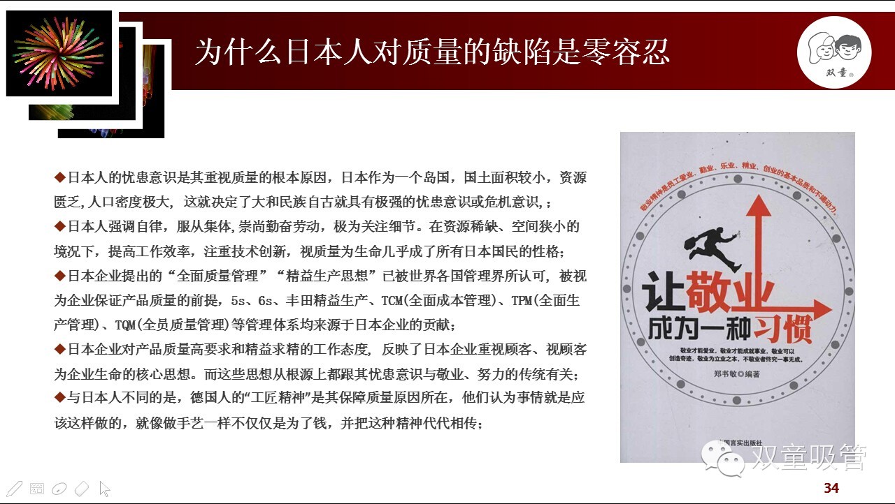 最后的第三部分,自然是課程的重中之重。董事長賣了這么久的關(guān)子,又是講大環(huán)境又是講企業(yè)發(fā)展和企業(yè)文化,終于還是繞到了“產(chǎn)品質(zhì)量”這個(gè)話題上來!在講述了雙童數(shù)次和日本客戶打交道之后的故事之后,他引用了陳春花的話說明質(zhì)量的重要性:淘汰企業(yè)的一定不是企業(yè)的規(guī)模、不是企業(yè)的技術(shù)、不是企業(yè)的品牌、也不是產(chǎn)品的價(jià)格。淘汰企業(yè)出局的一定是企業(yè)的顧客!唯有顧客才能決定企業(yè)是否能夠繼續(xù)生存!