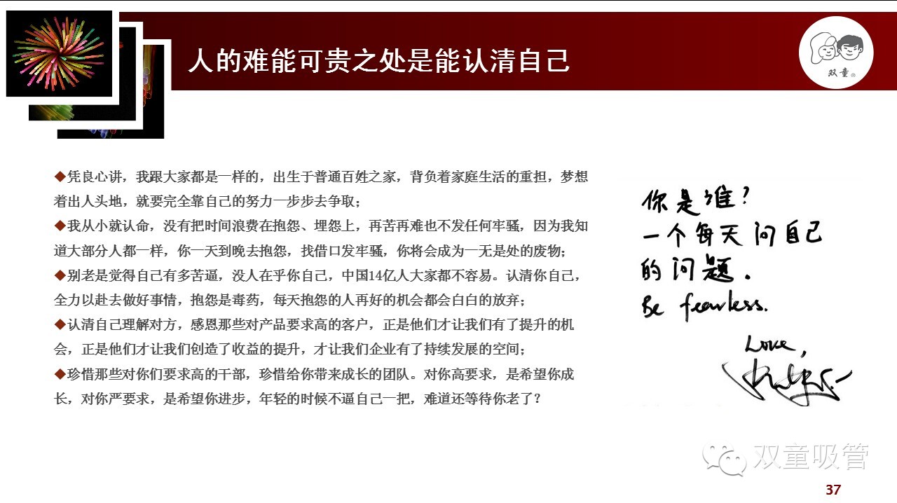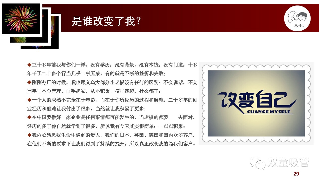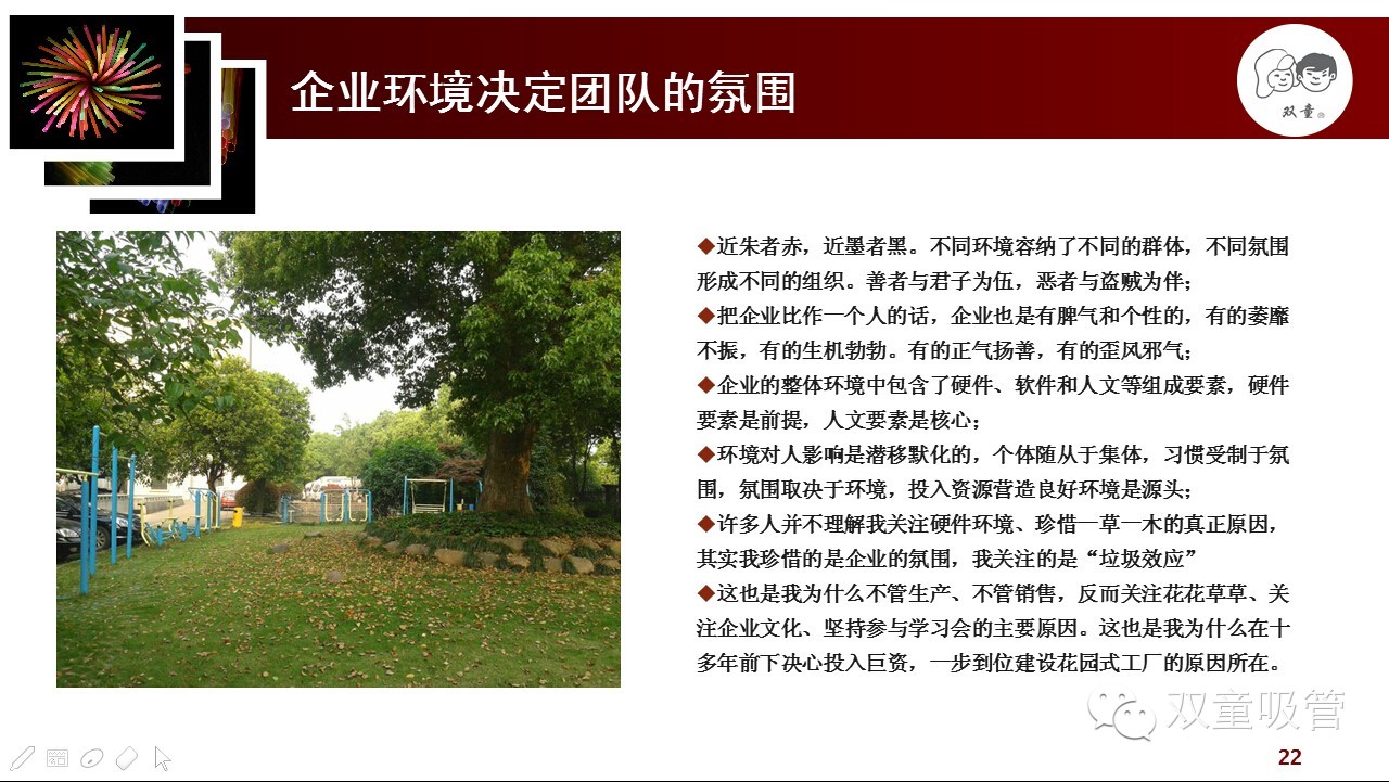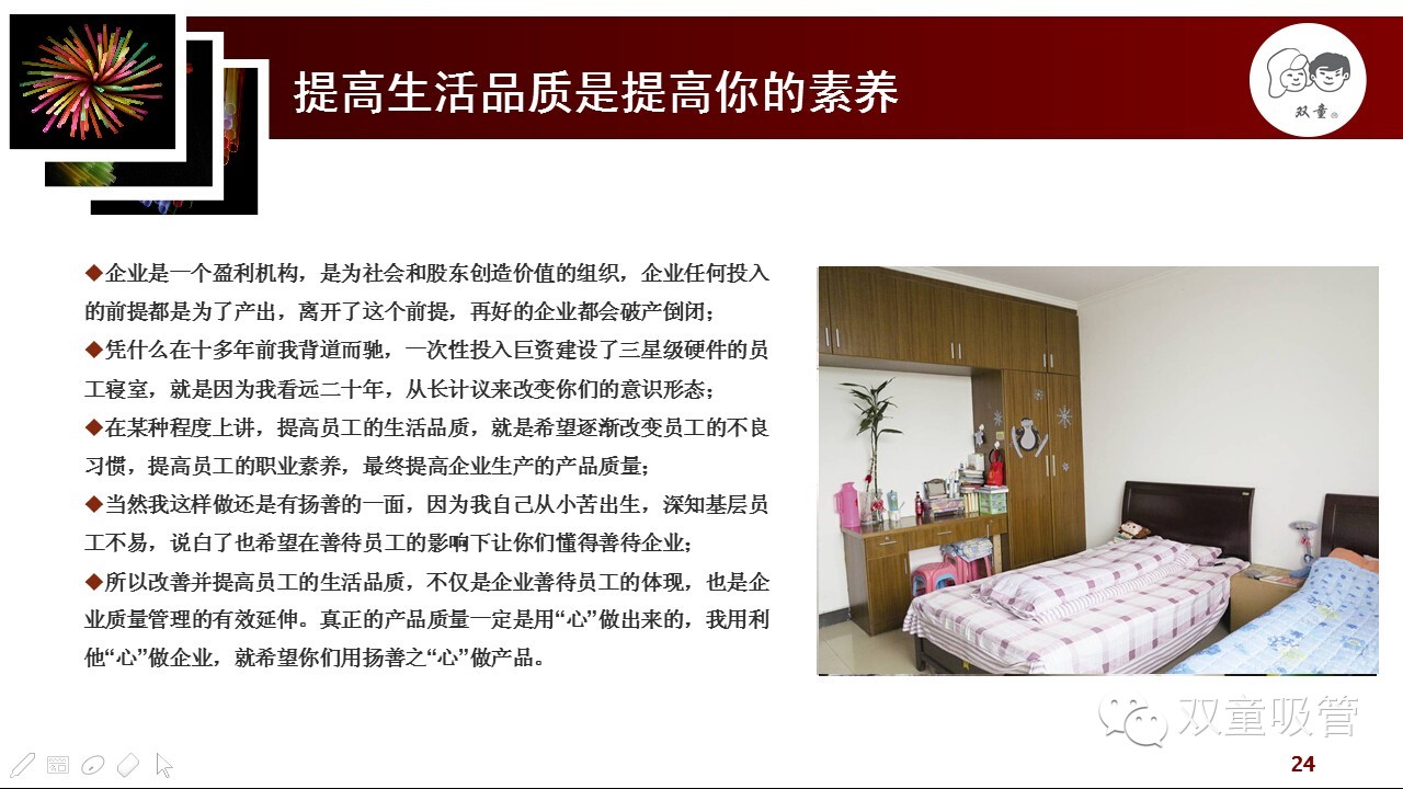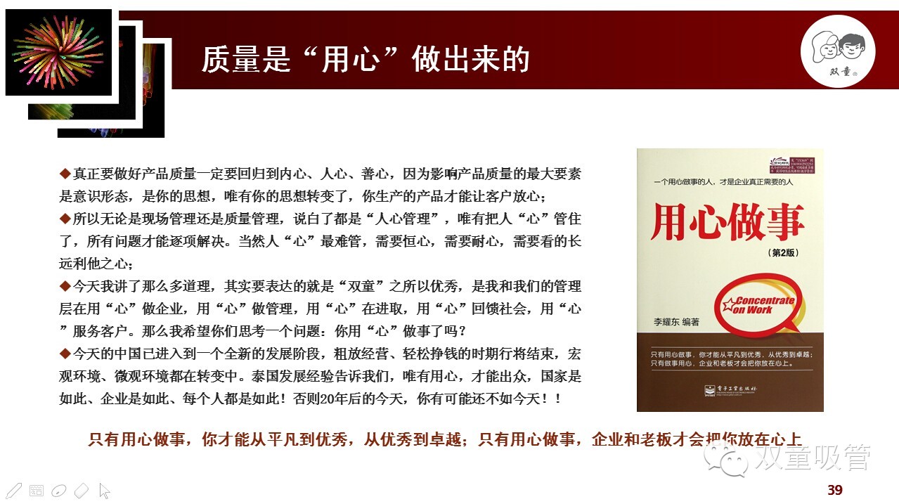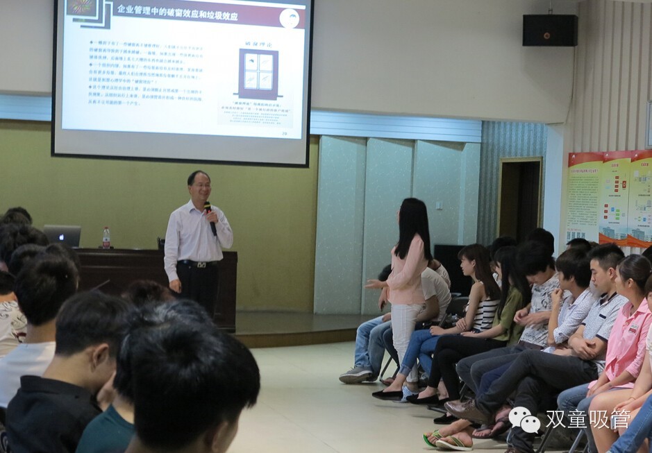 第二部分,董事長延伸到了我們雙童吸管的企業(yè)文化,向員工們講起了他的創(chuàng)業(yè)經(jīng)歷和管理雙童以來發(fā)生的一些故事。他說,無論是現(xiàn)場管理還是質(zhì)量管理,說白了都是“人心管理”,唯有把人“心”管住了,所有問題才能逐項(xiàng)解決。當(dāng)然人“心”最難管,需要恒心,需要耐心,需要看的長遠(yuǎn)做更多善待員工的利他之心。