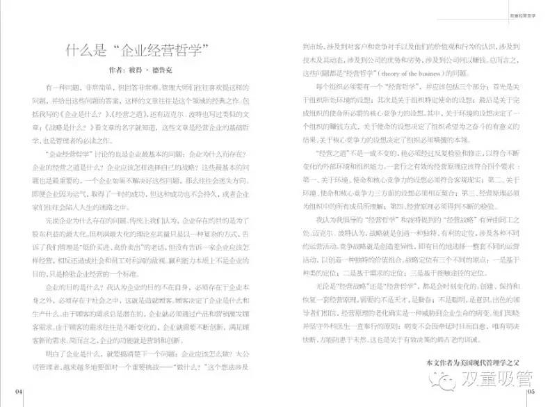 首先,《雙童經(jīng)營哲學(xué)》的開篇,就是美國現(xiàn)代管理學(xué)之父彼得德魯克所寫的《什么是“企業(yè)經(jīng)營哲學(xué)”》,通過他的講解闡述,使我們明白企業(yè)經(jīng)營哲學(xué)的重要性。