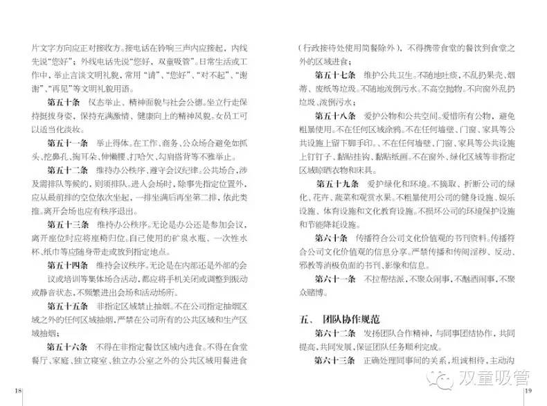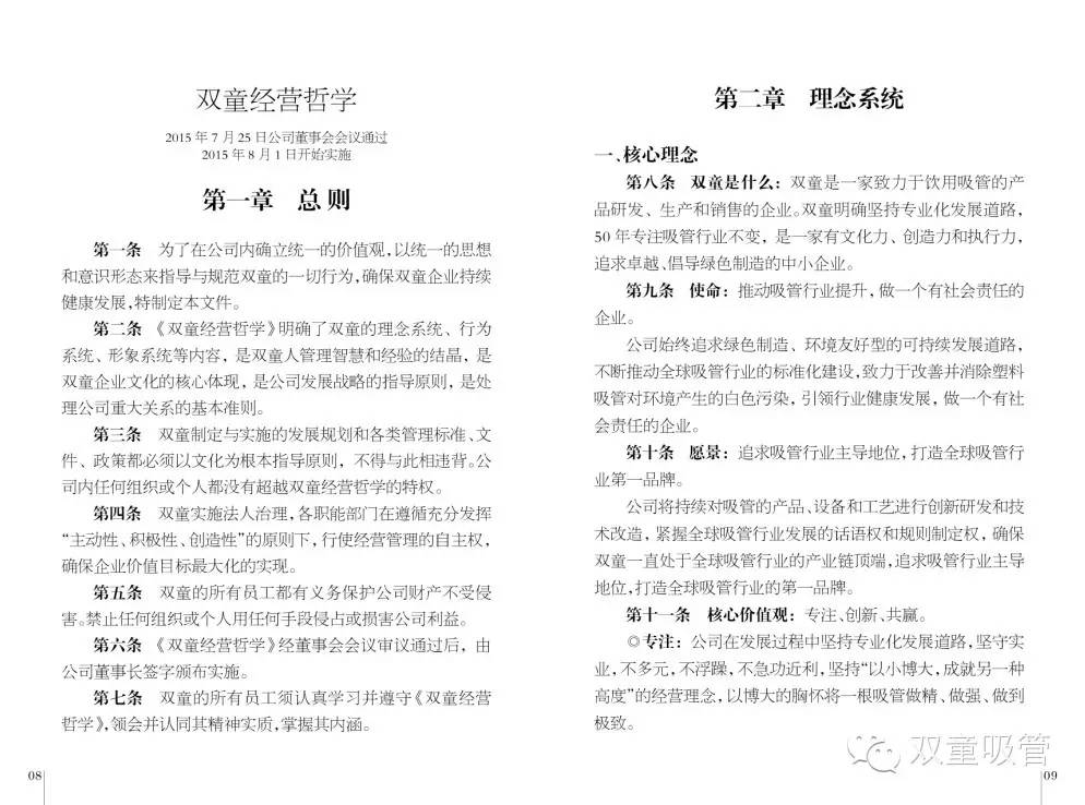 而這本《雙童經(jīng)營哲學(xué)》并不是一成不變的,在最后一章中,它規(guī)定每五年都要對《雙童經(jīng)營哲學(xué)》進(jìn)行重新修訂。它必須通過反復(fù)的檢驗(yàn)和修正,以符合不斷變化的外部環(huán)境和組織能力。