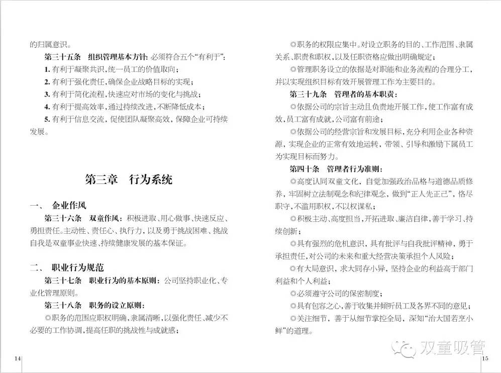 在《雙童經(jīng)營哲學(xué)》中,共分為五章內(nèi)容,分別為總則、理念系統(tǒng)、行為系統(tǒng)、繼任者培養(yǎng)、文化修訂。不論是企業(yè)的哪些行為,都可以從中找到依據(jù)和準(zhǔn)則。