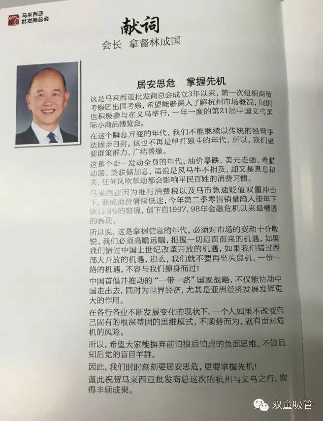 馬來西亞批發(fā)商總會(huì)是由一批參與批發(fā)與零售相關(guān)事業(yè)的人士發(fā)起成立的組織,此次來義烏,是該會(huì)成立3年以來,第一次組織商貿(mào)考察團(tuán)出國考察,希望能夠深入了解杭州市場(chǎng)概況,同時(shí)也積極參與我們義烏的第21屆義博會(huì)。