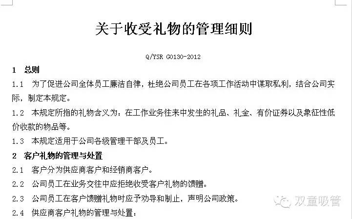 聽到這里,事情已經(jīng)告一段落,但是在這個小事的背后,卻是有一個制度在規(guī)范指引銷售部的收受禮物情況。這個制度就是我們雙童的《關(guān)于收受禮物的管理細則》。