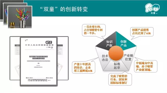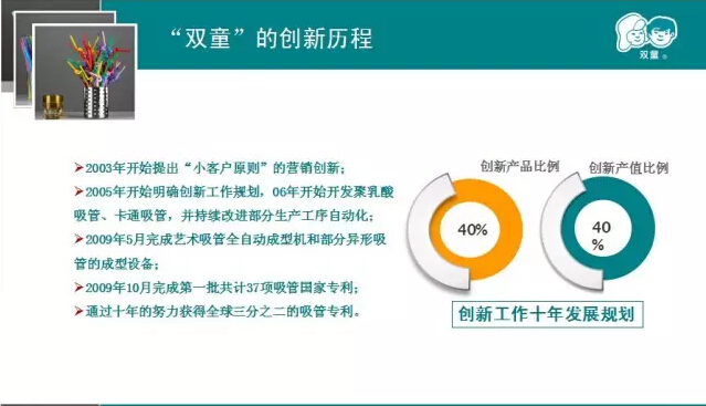 說起雙童的創(chuàng)新歷程,咱們的樓總還真是停不下來了呢!從2003年提出小客戶原則,05年開始明確創(chuàng)新計劃,06年開始開發(fā)聚乳酸吸管、卡通吸管,并持續(xù)改進部分生產工序自動化,慢慢的到今天生產出我們雙童特有的一些創(chuàng)新吸管!